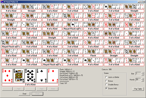 50 Hand Poker machines give the gambler up to 50 chances to win based on the same "hold" cards. If you get delt a royal flush, it is not one but 50! Got delt a 10 as your high card in an otherwise poopy hand? Hold it, you've got 50 chances to turn it in to something useful. See the pay tables for the pay outs on the various games.